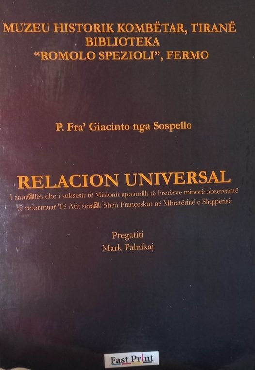-P. Fra’ Giacinto nga Sospello: “Relacion universal”, botoi Muzeu Historik Kombëtar, Tiranë dhe Biblioteka “Romolo Spezioli”, Fermo, përgatitur nga Mark Palnikaj, Tiranë, 2022.