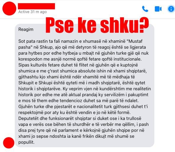 “Unë a budall jam që nuk shkoj në xhamia të Sulltanit?Aty gjen gjithçka, përveç se nuk e gjenë Paqen!Deputetë dhe ministrat janë përfaqësues të kombit mysliman në Maqedoni.E kanë patjetër me shku, por ty si t’i piu sorra mend me shku?Nëse dikush ka gjuhën e monstrumit janë disa kopila të Sulltanit që kanë mbetur në Shhkup.E keqja është se na shkruajnë shqip nëpër rrrjetet sociale. Edhe kjo është përparësi e jonë se i kemi shqiptarizuar, duhet me i mirëkuptuar se janë në skëterrën e tjetërsimit”.