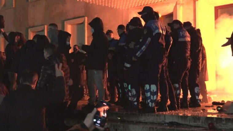 “Ekstremistë të dhunshëm kanë hedhur sende të forta, gurë, pllaka, kapsolla e sende të tjera, duke plagosur 9 punonjës policie dhe duke shkaktuar dëme të mëdha materiale në bulevardin “Dëshmorët e Kombit” dhe në Sheshin Skënderbej.