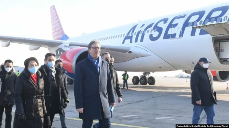 Presidenti i Serbisë, Aleksandar Vuçiq ka dalë në aeroport së bashku me ambasadoren kineze në Beograd, Chen Bo për të pritur avionin që bartte vaksinat.