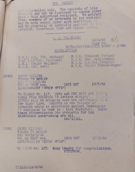 Shërbimi Sekret Ushtarak Britanik i ka përgjuar veprimet e nacistëve gjermanë në lidhje me formimin dhe operacionet e Divizionit Skenderbeg. Sot, në arkivin britanik ekziston një dosje voluminoze e kësaj pune. Por, nuk është shënuar asnjë veprim i këtij divizioni për qëllimin që ishte formuar.Në fotografinë e parë të postuar këtu (Document Top Secret), të datës 12. 5. 1944, bëhet me dije për një udhëtim të Xhafer Devës dhe Ago Agait, të cilët kthehen nga Gjermania me aeroplan përmes Beogradit. Po aty thuhet se njësitë shqiptare janë duke dështuar kundër komunistëve. [Pason teksti i cili për përgjuesit ka qenë i palexueshëm].