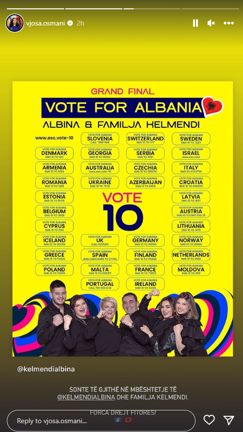 Presidentja e Kosovës, Vjosa Osmani, ka treguar mbështetjen e saj për Albina Kelmendin dhe familjen e saj që përfaqësojnë Shqipërinë në Eurovision 2023.