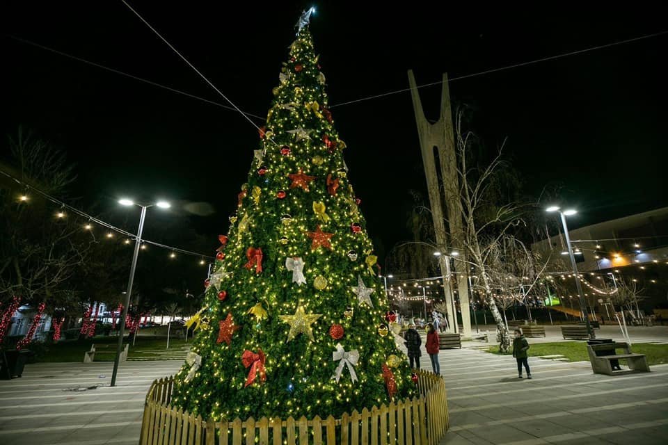 Edhe sheshi Adem Jashari, ku gjindet monumenti që dikur njihej si përmendorja e “Vëllazërim-Bashkimit” është zbukuruar me drita dhe me një bredh modest por mjaft të bukur.