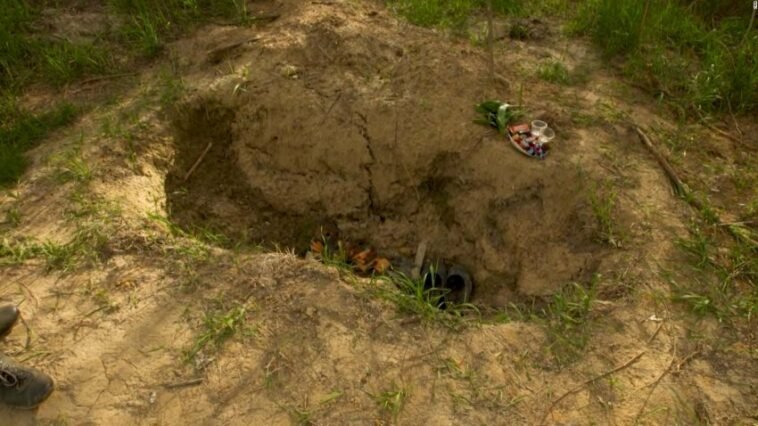 Në anë të një rruge të largët në rajonin verior të Chernihiv të Ukrainës, Mykola tregon varrin e pashënuar në të cilin ai dhe dy vëllezërit e tij u varrosën tre javë e gjysmë pas fillimit të luftës, në tokën e pushtuar nga forcat ruse.